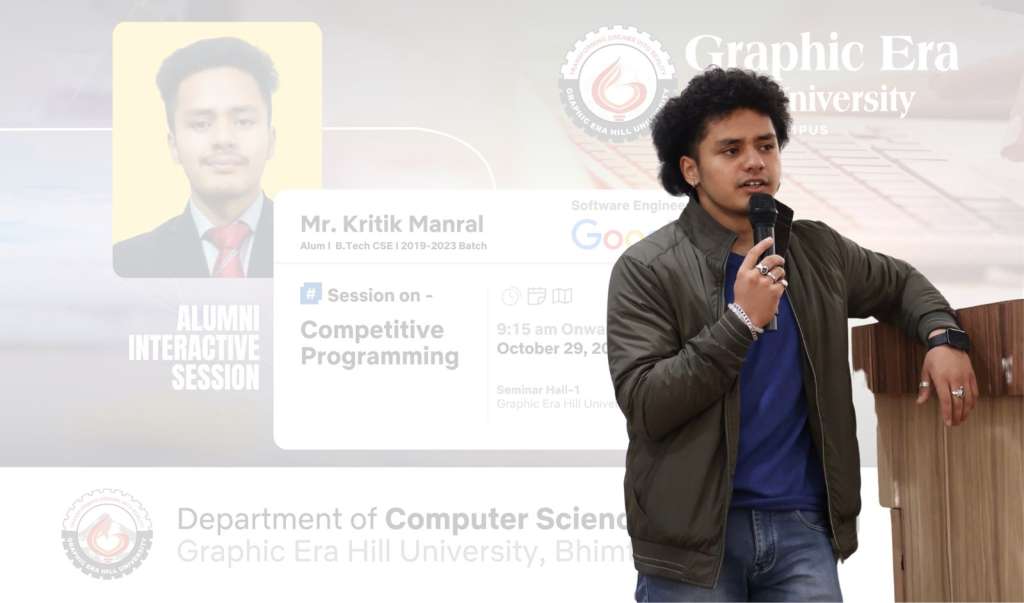 ग्राफिक एरा हिल यूनिवर्सिटी, भीमताल के कंप्यूटर साइंस एंड इंजीनियरिंग विभाग द्वारा एक प्रेरणादायक एलुमनाई इंटरैक्शन सत्र का आयोजन किया गया, जिसमें 2019-2023 बैच के प्रतिभाशाली पूर्व छात्र मि. कृतिक मनराल, जो वर्तमान में गूगल में सॉफ्टवेयर इंजीनियर के पद पर कार्यरत हैं, ने छात्रों से संवाद किया।